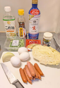 材料:炊飯釜にあったご飯、ウィンナー、キャベツ、タマネギ、ネギ、玉子、調味料、油
