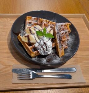 元田中周辺でおすすめのカフェはCafe23です。おすすめのメニューはワッフルです。色々な種類のクレープがあり、ドリンクも豊富な上、どれも美味しいです。また、ここは朝8時半から営業していて、コンセントもWi-Fiも提供してくれるので、軽い勉強や読書をするのにも向いています。もし一限の授業がないときに朝からこの店で読書でもできたら、最大の初速で一日をスタートできること間違いなしです。