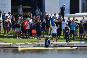 続きまして二枚目です。こちらもインカレ期間中に撮られた写真です。これは「蹴りだし」と呼ばれるもので、レースに出場する選手が船に乗ってレース前のアップに入る直前に部員やOBOGさんが集まって選手を鼓舞している風景です。一番手前の船に乗っている選手が今からレースに出ようとしている選手で、陸内の最前列にいるのがその選手のコーチ、その後ろにいるのが部員となります。実は著者も過去選手をやっていた時がありまして、この蹴りだしなるものをしていただいたこともあるのですが、なかなか爽快で気分が乗る感覚がありかなり気持ちのいいものでした。ちなみに、この選手の方はこの大会の一人乗りの女子部門で三位を獲得していらっしゃいます!!