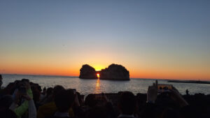 白浜のサンセットスポット。円月島の穴に太陽が収まる瞬間を、ぜひ見に行ってほしいです!この写真は一緒に行った同期が撮影したもので、すごくきれいです。